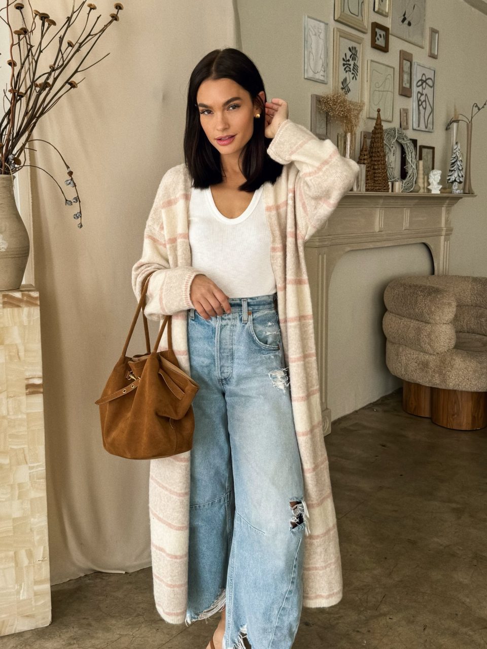 Meet our NEWEST obsession in our winter sweater rotation! Style our All Wrapped Up Knit Sweater with your favorite wide leg denim. cream booties. and a mini crochet bag for a cozy and chic daytime look! Accessorize with gold jewelry and black sunnies.