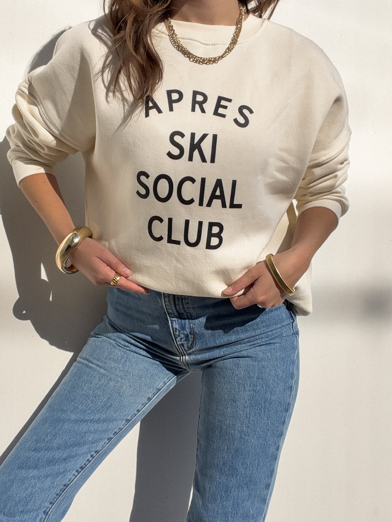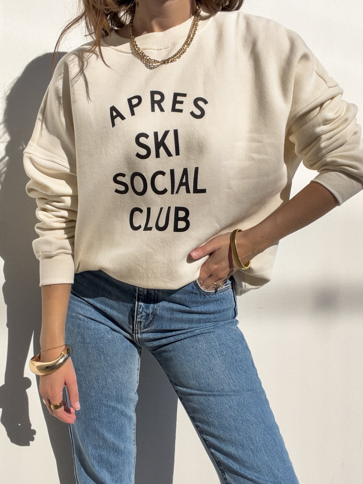 We’re just here for the Apres… Introducing our NEW Apres Ski Social Club Sweatshirt! Pair with black leggings and white sneakers for a cute. winter on-the-go look.