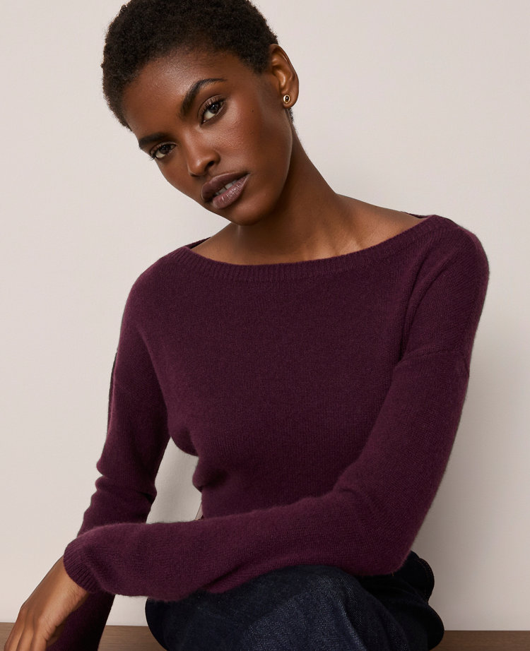 A flattering off-the-shoulder neckline shapes this luxe cashmere sweater. Ribbed off-the-shoulder neck, hem and cuffs. Long sleeves. Dropped shoulders.