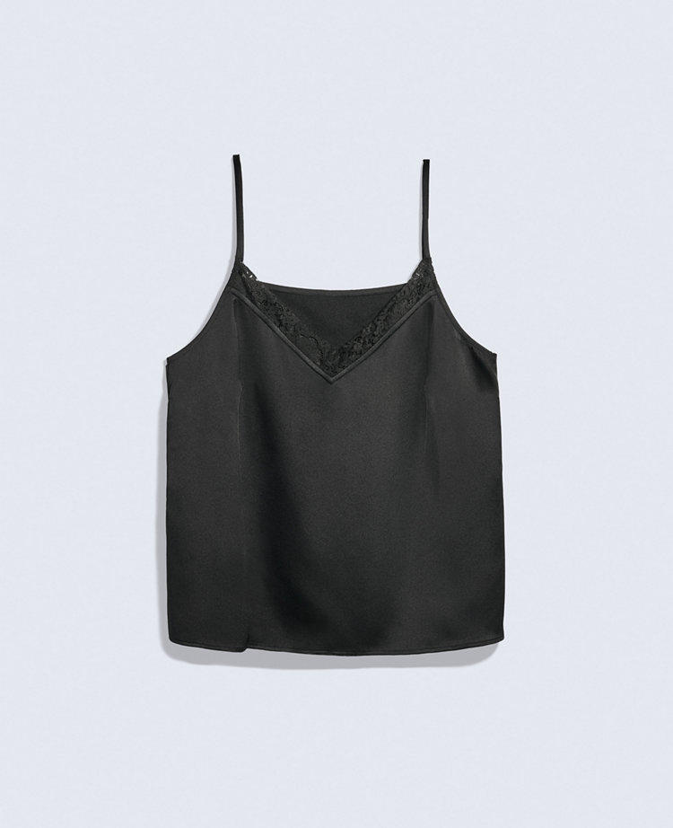 The trim of this fluid, versatile tank lends a lovely peek of lace, perfectly layered under blazers and knits. V-neck. Adjustable spaghetti straps.
