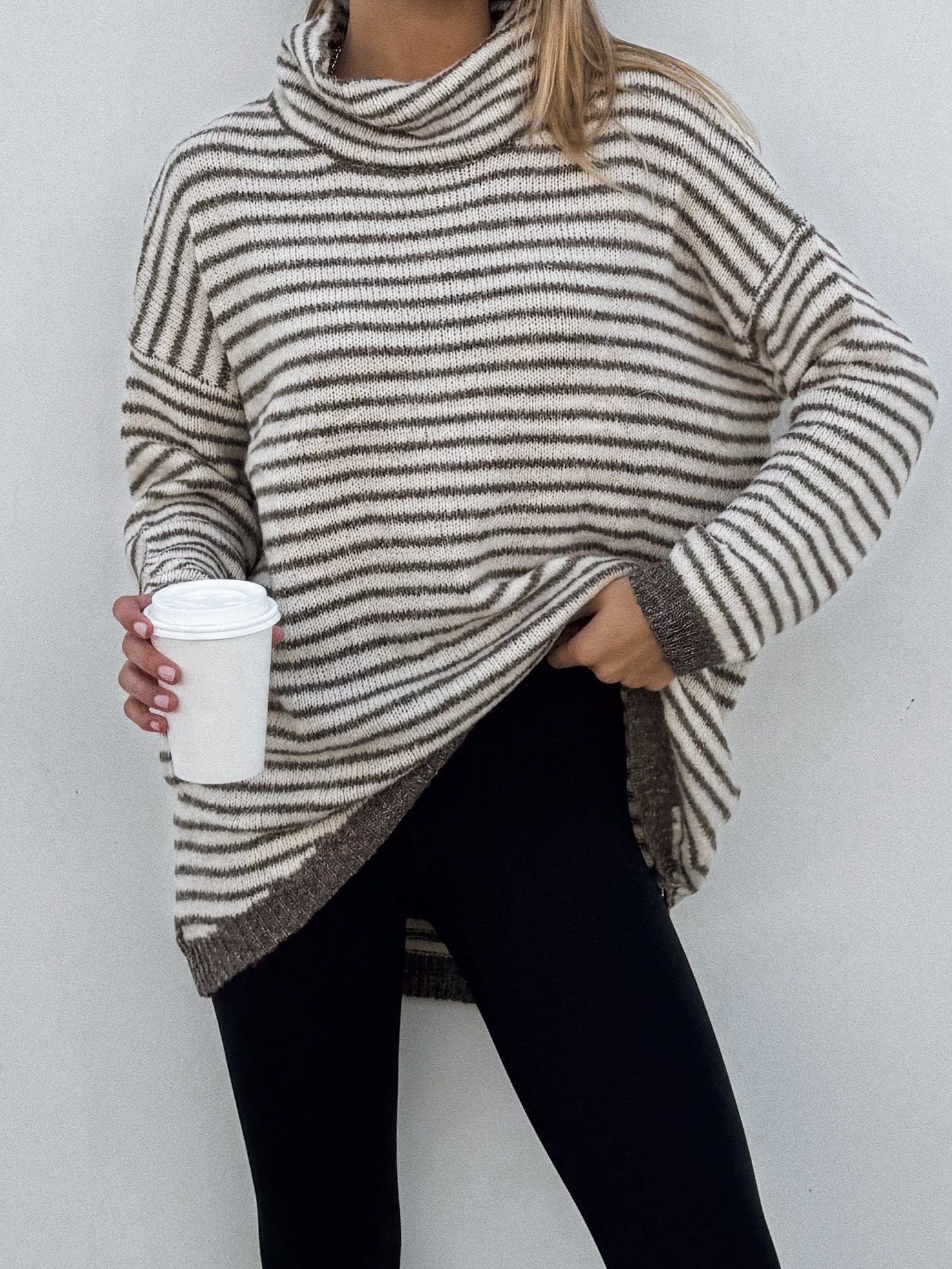 Forget diamonds. stripes are a girl’s best friend. Style our Mocha Stripe Knit Sweater with vegan leather leggings and booties for a chic day to night look.