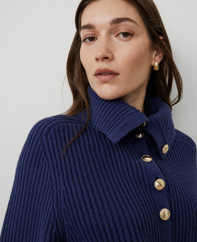 Cozy and relaxed with a rich ribbed finish, this buttoned-neck sweater is a stylish staple to live in. Fold-over collar. Front Henley button placket. Long dolman sleeves. Contrast ribbed cuffs and hem.