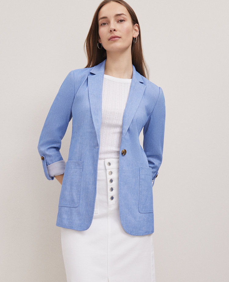 Discover Ann Taylor Weekend. Effortlessly polished pieces for wherever your plans take you. With a relaxed fit and a lightweight linen-blend finish, this blazer works a carefree angle on smart layering. Notched lapels. Single-button front. Long sleeves with roll-cuff button tabs. Front patch pockets. Back vent. Partially lined.