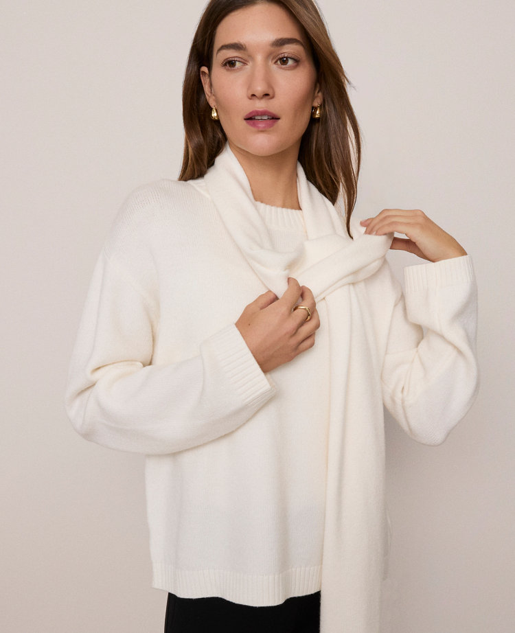 Discover Ann Taylor Weekend. Effortlessly polished, lived-in looks for wherever your plans take you. Versatile and polished, this sweater is designed with a removable scarf you can loop around your neck or drape over one shoulder. Mock neck. Long sleeves. Back-button removable scarf. Ribbed cuffs and hem.