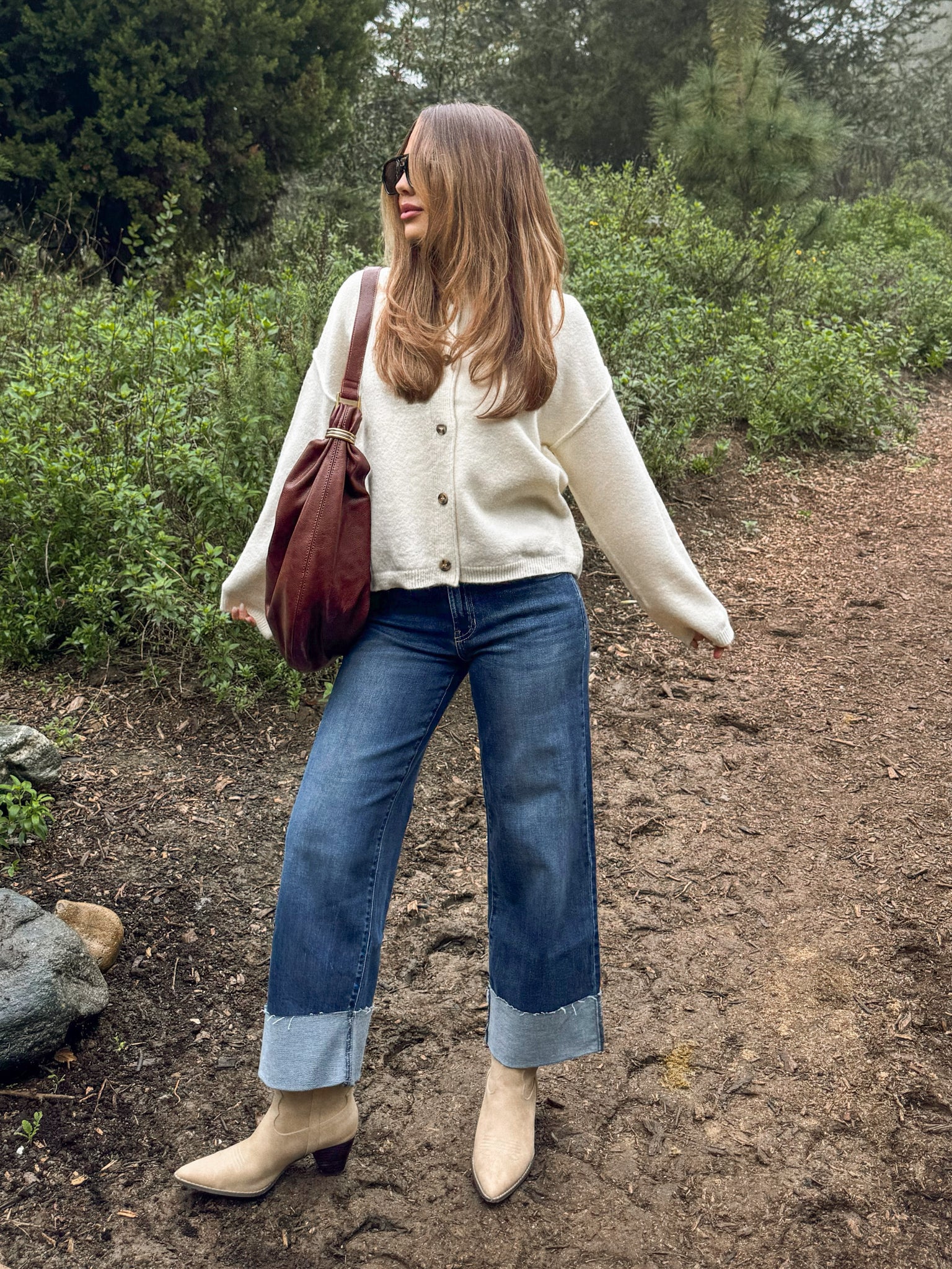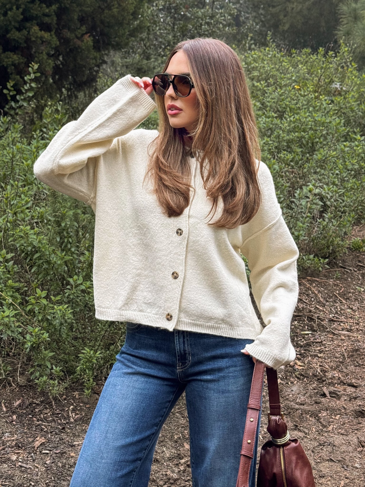 Style our new Stevie Button Knit Sweater buttoned with a white tee underneath. black trousers. white crew socks. and black loafers for a chic and preppy look. Accessorize with a belt and leather tote bag to elevate the look!