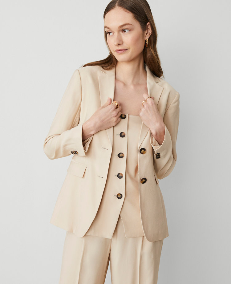Comfort chic at its finest, our tailored blazer plays very well with others: Mix and match the collection with ease. Notched lapels. Double button front. Long sleeves with button cuffs. Front flap besom pockets. Back vent. Lined.
