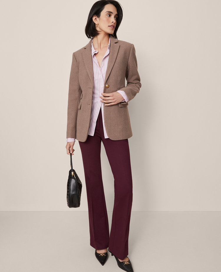 These skinny flare pants are the perfect balance of modern styling and timeless detail. Front zip with double hook-and-bar closure. Front off-seam pockets. Back besom pockets.