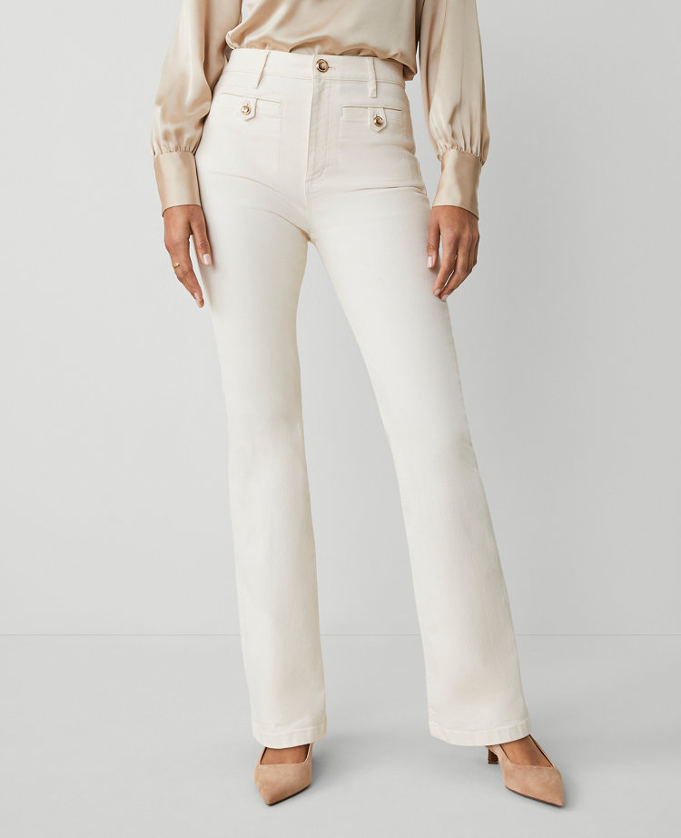 Our high-rise flare jeans are designed with new pockets that smooth, flatter and hold your shape. Performance stretch denim sculpts, shapes and supports all day long. Front zip with a button closure. Belt loops. Button tab welt pockets. Back patch pockets.
