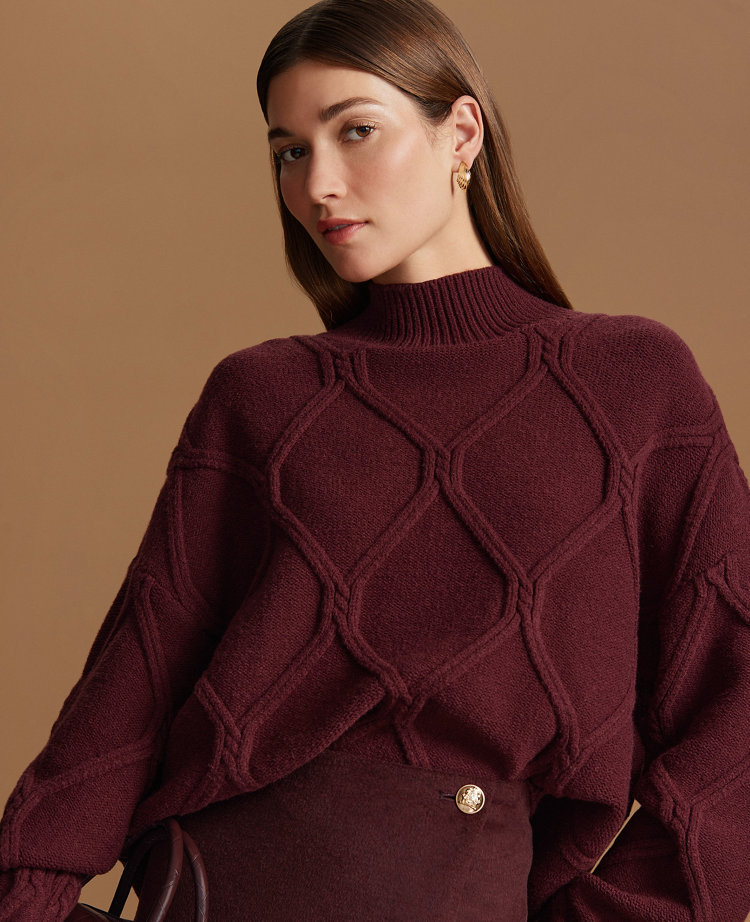 Discover Ann Taylor Weekend. Effortlessly polished, lived-in looks for wherever your plans take you. Cozy up with this plush sweater, featuring a chic and timeless diamond cable pattern. Mock neck. Long sleeves. Dropped shoulders.
